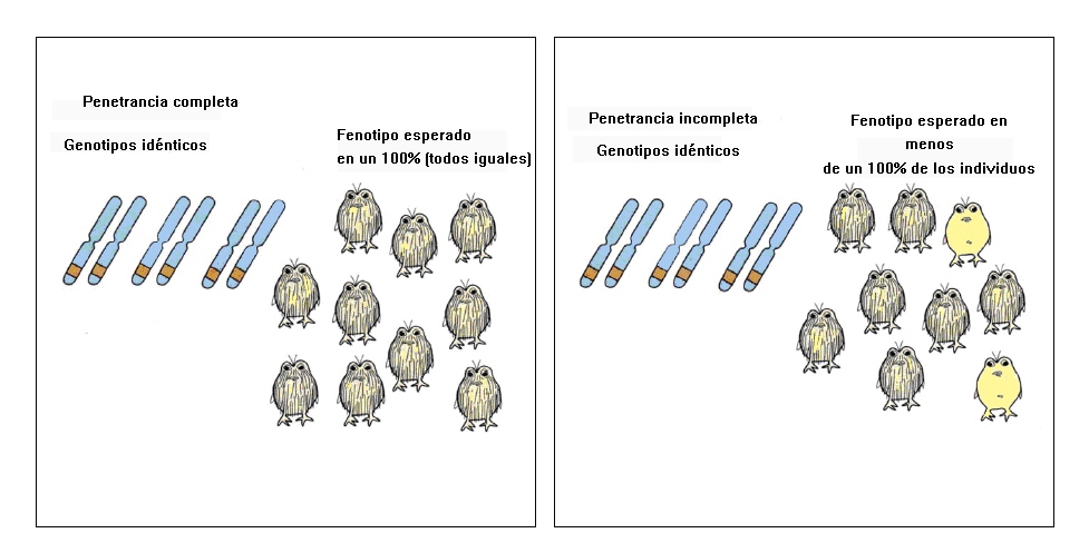 La penetrancia es la proporción de una población que expresa el fenotipo entre todos los que presentan un genotipo de un alelo determinado. Cuando esta proporción es inferior al 100%, se considera que el genotipo tiene una penetrancia reducida o incompleta. Por ejemplo, la enfermedad de Huntington presenta una penetrancia del 95%, lo cual implica que solamente un 5% de las personas portadoras del genotipo asociado a la patología no desarrollan síntomas de la enfermedad. En ningún caso el término penetrancia hace referencia al grado de expresión del fenotipo, en cuyo caso se hablaría de expresividad, sino tan solo a la presencia o ausencia de un fenotipo determinado.
